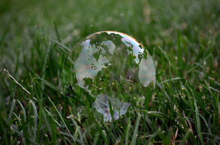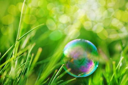 The soap bubble shimmers against the background of green grass and palms. Close-up photo. concept of fragility