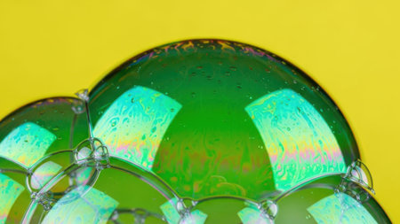 Liquid soap bubbles with rainbow patterns. Abstract spherical shapes on yellow background. Geometric soapy texture.