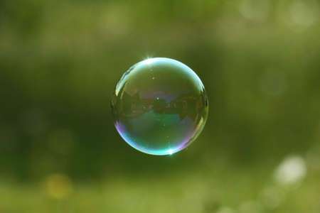 Colorful soap bubbles in the garden with beautiful bokeh.