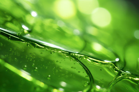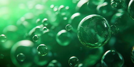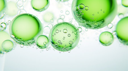 Transparent macro bubbles, science cosmetic, 3D Collagen serum and vitamins, hyaluronic acid skin care solutions with cosmetic advertising background in green colors