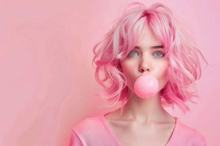 A charming portrait of a young girl blowing bubble gum against a bright pink background, radiating joy and playfulness with her vibrant style and expressive features.
