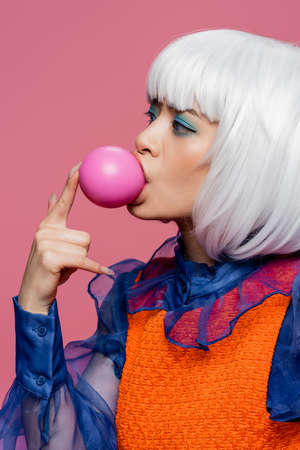 Stylish asian woman touching hair and blowing bubble gum isolated on pink