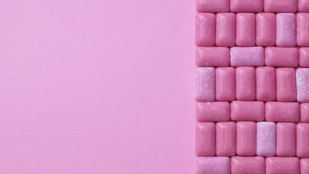 Many sweet chewing gums on pink background, flat lay. Space for text