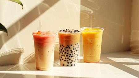 Aesthetic bubble tea on sunny hot day. Drink with tapioca bubbles. Fashionable cafe. Summer atmosphere. Generative AI.