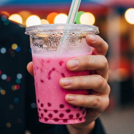 A refreshing cup of bubble tea filled with colorful tapioca pearls sits on a table. It is surrounded by a lively, glowing atmosphere at a night market.
