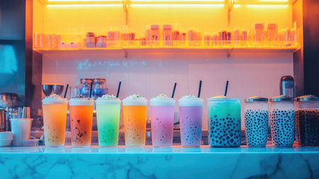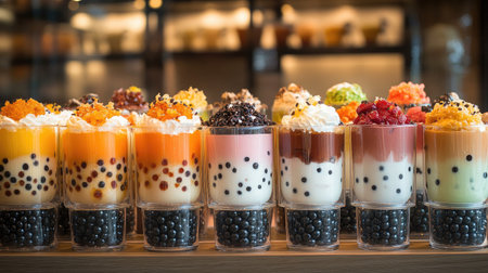 A beautifully arranged display of assorted bubble tea cups in various flavors, each adorned with unique toppings and colors, creating a visually appealing and inviting atmosphere.