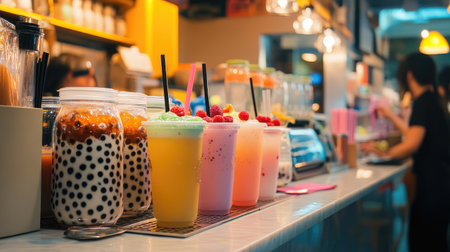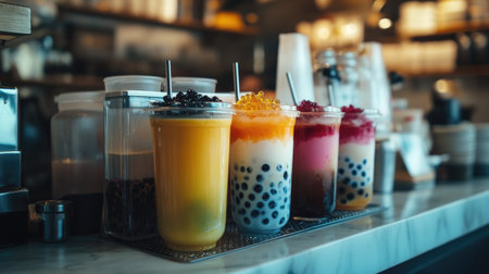 A vibrant shot of a bubble tea shop counter with a selection of bubble tea drinks, toppings, and syrups, showcasing a busy and lively caf atmosphere.