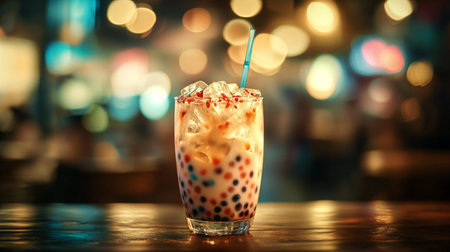 A vibrant drink with colorful tapioca pearls and colorful straws sits on a rustic wooden table, enhanced by soft, blurry lights that create a festive atmosphere.