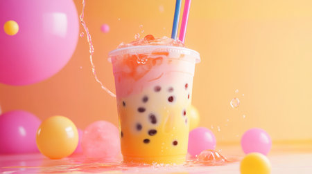 A vibrant glass of bubble tea filled with creamy milk tea and chewy tapioca pearls, garnished with a colorful straw, set against a bright, cheerful background
