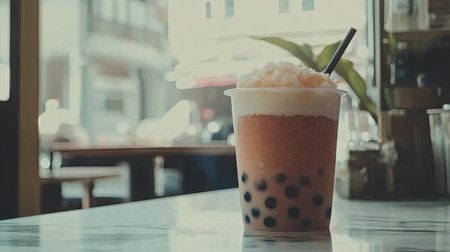 Enjoy a close-up view of a refreshing bubble tea with creamy topping and tapioca pearls, capturing a delightful drink served in a cozy caf