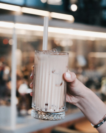 A close-up shot of a hand holding a cup of bubble tea, with the tapioca pearls visible at the bottom and the creamy layer on top, showcasing the delicious texture and colors.