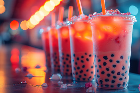 Bubble tea on cafe counter with neon lights in cozy atmosphere. That the image is generated using AI.