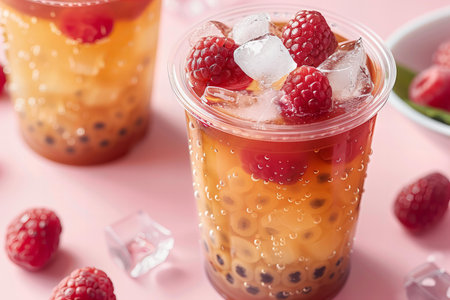 Glasses of bubble tea with raspberries on pink background, closeup