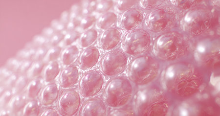 Close-up of textured pink material with rounded, air-filled protrusions. Shallow depth of field