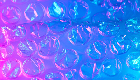 A macro view of bubble wrap transformed by vibrant holographic light.
