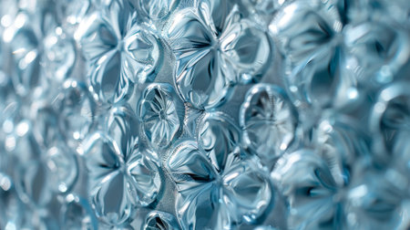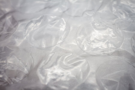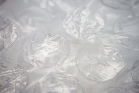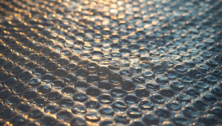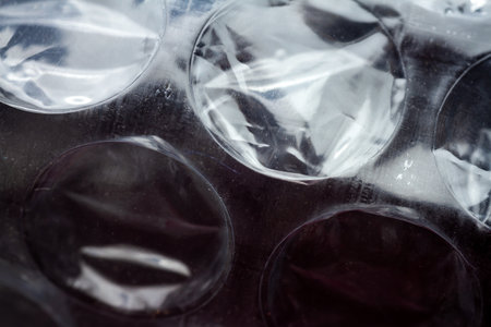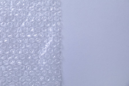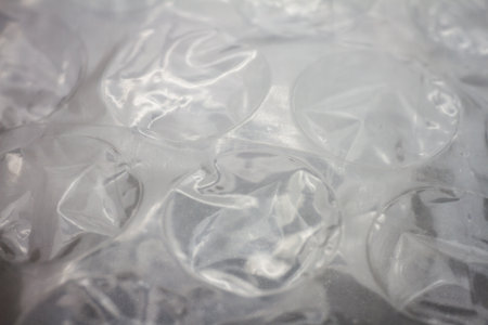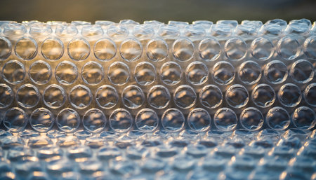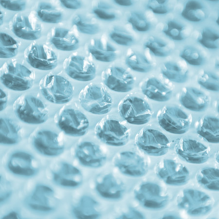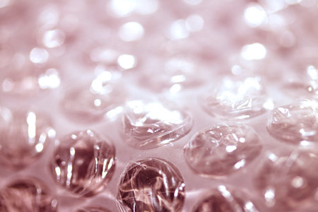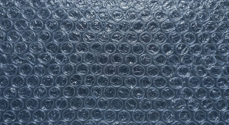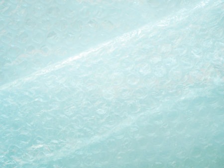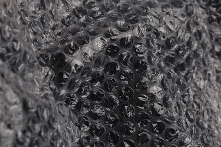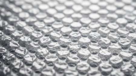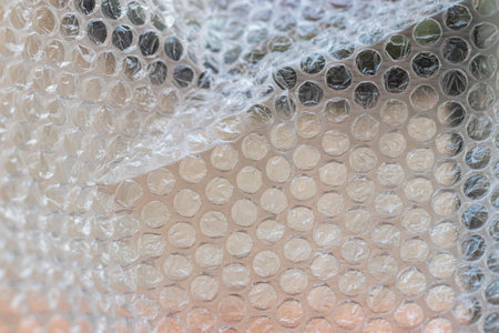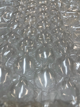 Close-up of bubble wrap texture with air-filled pockets. Transparent plastic material designed for protecting delicate objects. Detailed macro shot showing light reflections on bubbles