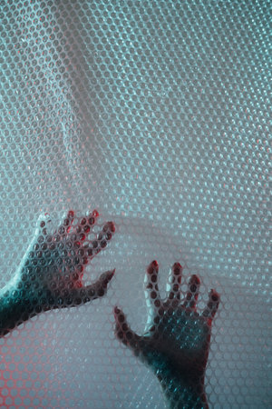 Nightmare horror. Emotional trap. Mental disorder. Defocused female hands clawing scratching transparent plastic wrap textured wall free space background.