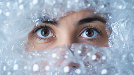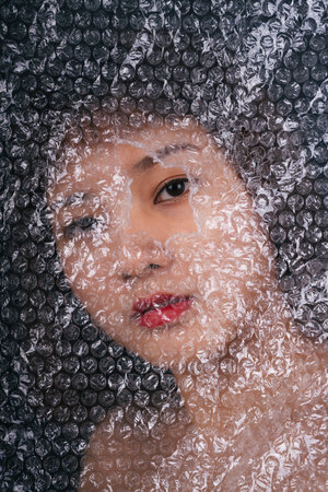 Asian thai woman behind plastic wrap with eye on a hole. Close up portrait.