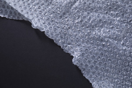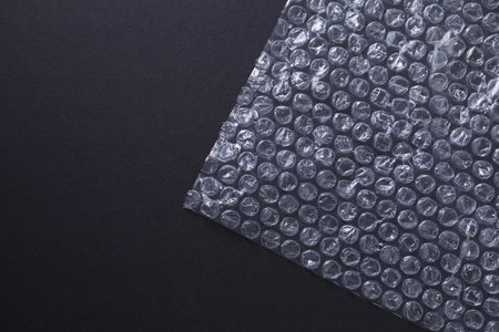 Transparent bubble wrap on black background, top view. Space for text