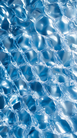Up-close capture showing the intricate, interconnected pattern of translucent blue cellophane, displaying a network of cells reflecting light, offering a unique textured view of packaging material.