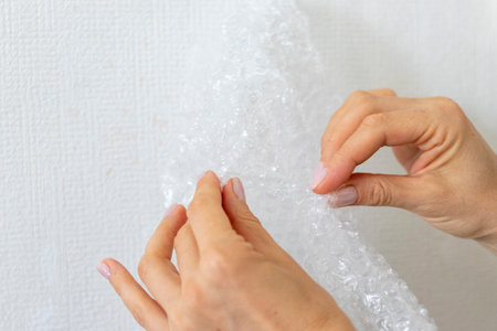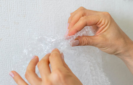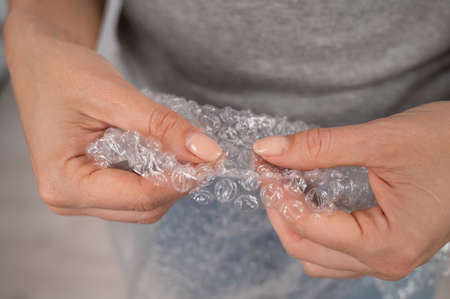 Shot of the woman bursts bubble wrap.
