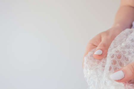 Cellophane film for packaging with air in female hands with copy space. Wrap Packing Close Up, Copy Space