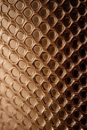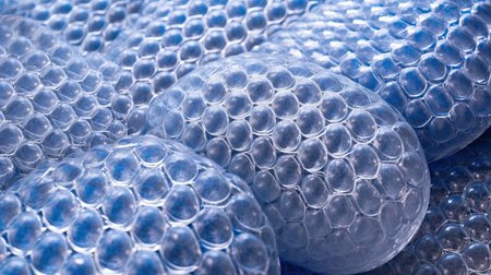 Abstract background of transparent plastic air cushions arranged in a grid pattern, showcasing its protective qualities and unique surface texture