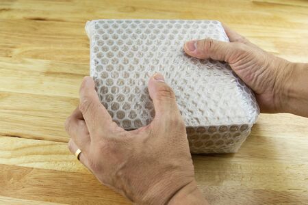 hand of man hold Bubbles covering the box for protection product cracked or insurance During transit