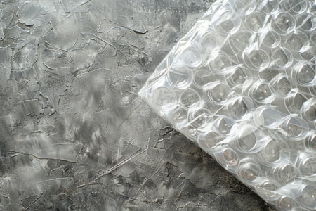 Close-up of bubble wrap lying on a textured gray concrete surface, showing a contrast between smooth and rough textures.