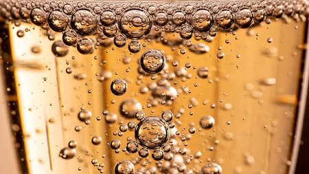 Macro shot of bubbles forming on the surface of a fizzy, golden-hued drink