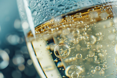 Champagne bubbles in a glass close-up macro shot with shallow depth of field