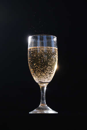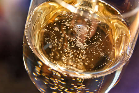 Close up (macro) of sparkling champagne flute style glass, wiith rising bubbles topped by layer of froth.