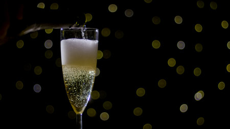 Hand pouring sparkling bubbling champagne into a glass on a festive background, close up shot. Happy New Year and Happy Birthday concepts.