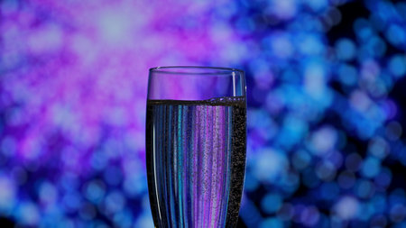 Close up of a champagne glass with golden bubbles against a backdrop of blue bokeh fireworks. A festive mood for holiday, New Years, and Christmas parties.