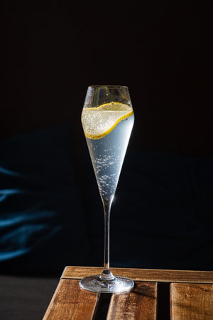 A delicate glass showcases a sparkling beverage adorned with a lemon slice, resting on rustic wood.