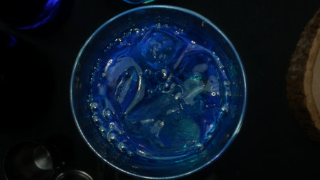 Macrography with a top-down view of a professional bartender hand elegantly serving a Blue Hawaii cocktail with black background. Close-up shot captures the fluid motion. Aerial view. Comestible.