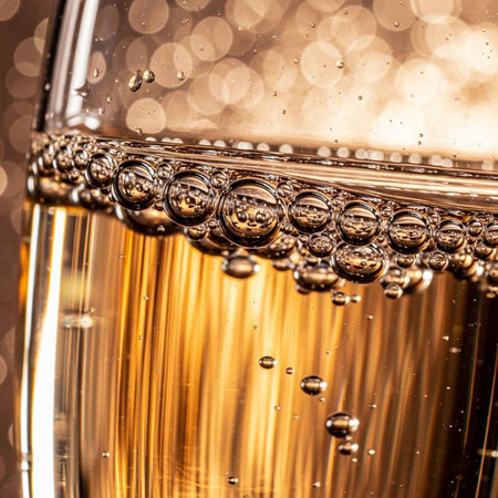 showing champagne bubbles forming a foamy head in a glass with golden bokeh lights.