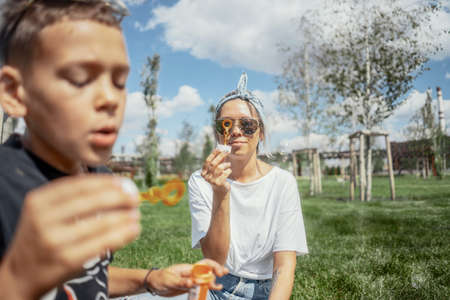 Happy family blowing bubbles outdoors in the park and having fun.
