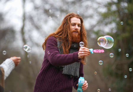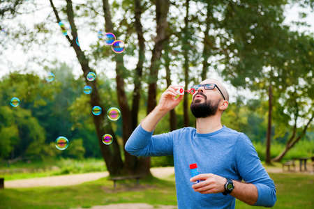 Bearded man blowing soap bubbles in the park in summer. Enjoying life and freedom