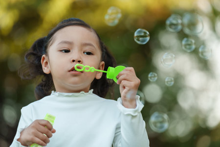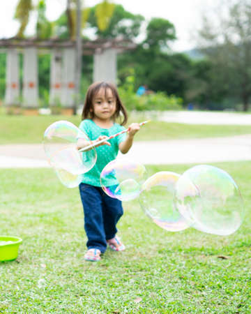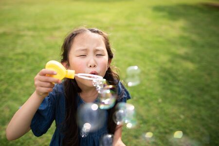 Lovely active little asian girl playing with soap bubble outdoor in the park