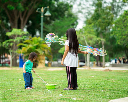 Lovely active asian girl siblings playing with soap bubble outdoor in the park