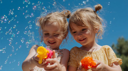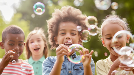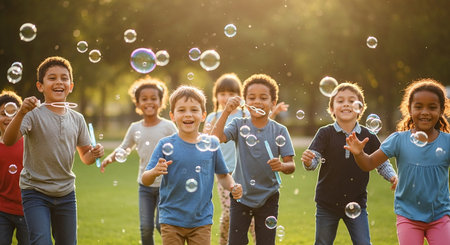 Children happily blowing colorful bubbles in bright outdoor setting under the sun