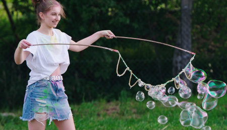 Beautiful girl is playing soap bubble fun.