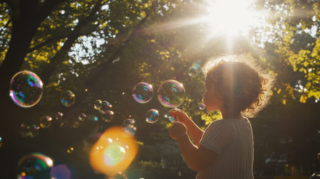 A child blowing bubbles in the park, with iridescent spheres floating through the warm summer air.