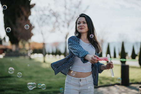 Young woman joyfully playing with bubbles in a sunny park setting