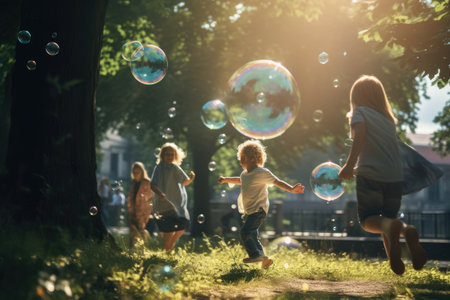 Children playing with bubbles in a sunlit park, capturing a moment of joy and innocence.