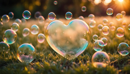 Heart shaped soap bubbles outdoors generative AI illustration
