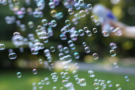 bright soap bubbles on summer natural green abstract background. many flying soap bubbles in sunny day. spring or summer season. symbol of childhood, purity, ecology