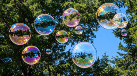Soap bubbles rising against a bright blue sky, with sunlight enhancing their rainbow reflections and whimsical feel.