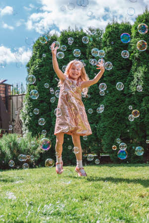 young smiling beautiful girl with long wavy fair hair in sparkling dress jumping, catching soap bubbles having fun on green lawn in backyard garden. Childhood, summer activities concept.